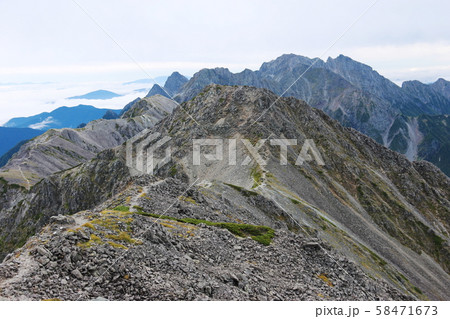 北アルプス 中岳山頂からの風景 南岳越しに穂高連峰への縦走路を望む