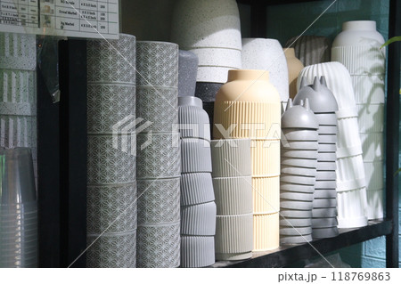 Unusual houseplants in pots on wooden shelf in modern plant shop interior, no people shot