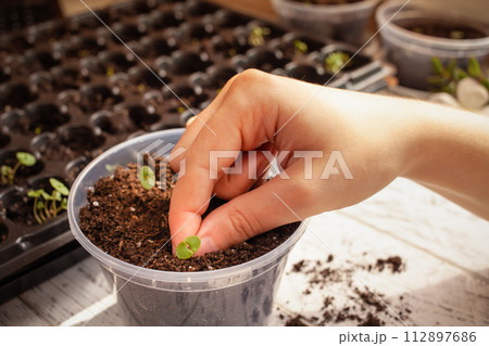 Flower transplant. Cells for growing seeds.