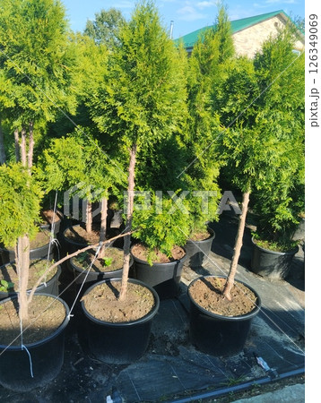 tree seedlings in pots. Nursery of spruce and thuja seedlings