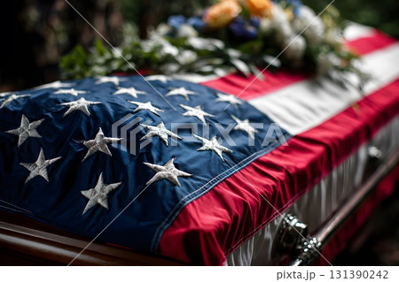 Flag United States draped over coffin with flowers.