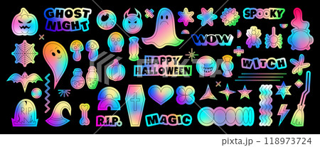 Halloween metal sticker. Y2k icon. Gradient hologram. Autumn foil pattern. Spider and ghost elements. Pumpkin holo futuristic badge. RIP gravestone. Metallic evil face. Vector holographic garish set