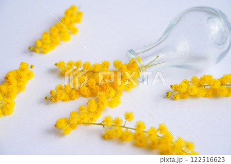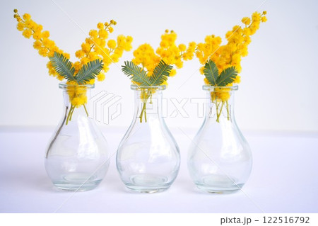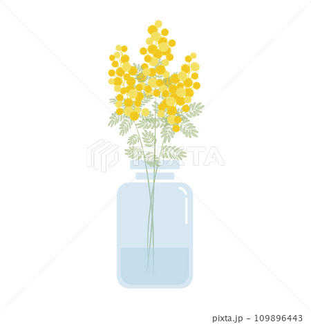 透明なガラスの花瓶に入った黄色いミモザの花のイラスト