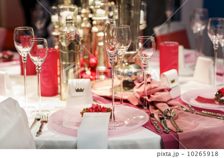 Beautiful table setting for a party, wedding reception or other festive event. Banquet setting, glasses, plates.