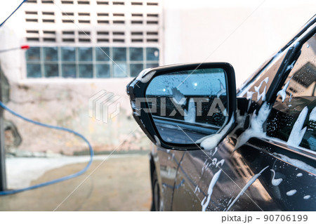 Side view, car wash, high pressure. Man is with his automobile outdoors