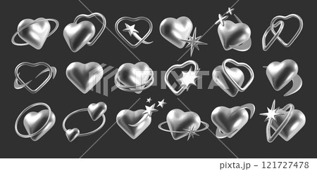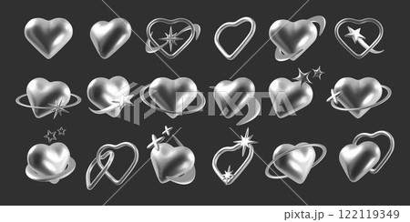 Chrome heart. 3d silver futuristic design, modern stylish star elements as cyber Y2K concept, digital love stickers 90s collection. Holographic liquid romantic symbols. Vector isolated set
