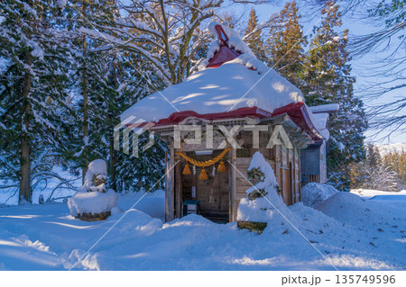 冬の神社、雪に包まれた小さなお宮と木漏れ日が揺れる社殿の風景