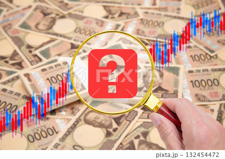 疑問符(大量の日本円を背景にしたローソク足チャートに疑問符)