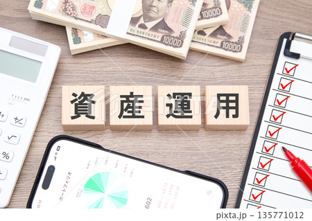 投資イメージ(札束とスマホと電卓とチェックリスト)