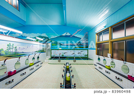 富士山の絵が描かれた典型的な日本の銭湯