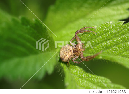 草葉に身を潜める茶色いトラフワシグモ(自然光マクロ接写)