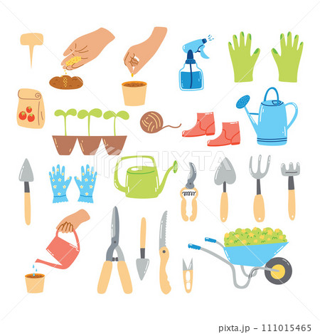Set of hand drawn garden elements. Cartoon flat illustration of farm equipment, agriculture items