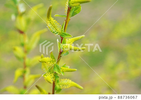 淡い黄色のシバヤナギの花穂(春、三月)