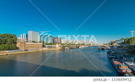 The Austerlitz viaduct in Paris timelapse hyperlapse, seen from bank of the river Seine with a metro train passing