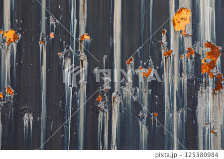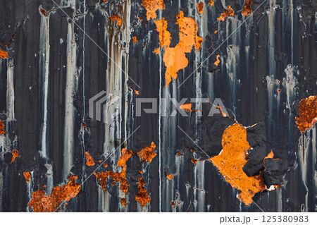 黒い塗料が剥げて茶色い鉄さびが見える壁、背景素材