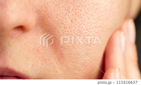 Close-up of part of the face. facial skin with enlarged pores, problem skin. Cosmetology. texture skin. skin health. illness skin