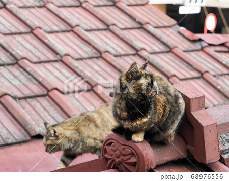 屋根の上のサビ柄の野良猫