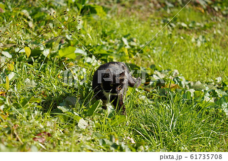 猫・野良猫・錆柄・クロちゃん・朝日・快晴・草原・歩く