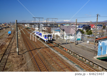 春の北海道苫小牧市JR錦岡駅を発着する普通列車の風景を撮影