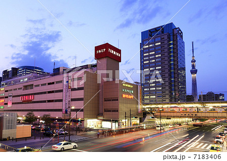 日本の東京都市景観 錦糸町駅前のビルガラスに映る東京スカイツリーや錦糸町駅直結の駅ビル「テルミナ」