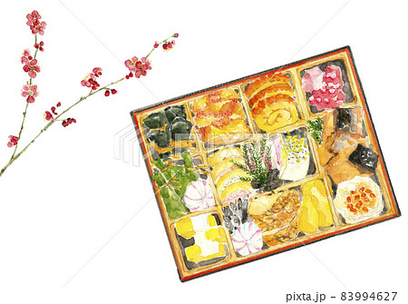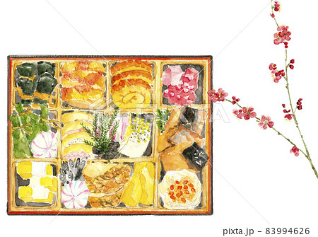 紅梅を添えたお重に詰めたお節 (おせち)素材【水彩イラスト】白バック コピースペースあり透過背景