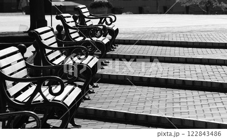 広場の緩やかな階段に並ぶベンチ