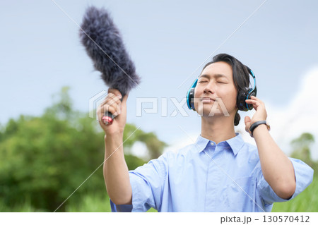 ヘッドホンをつけて音をチェックするサウンドエンジニア