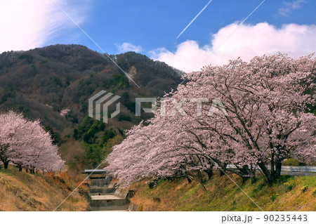 山梨県韮崎市神山町鍋山 川沿いの桜並木の満開のソメイヨシノと奥の山々の稜線の景色