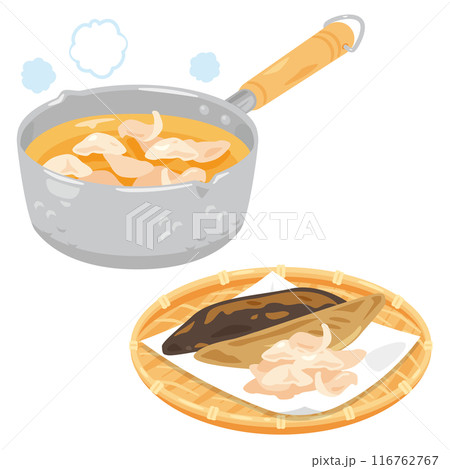 鰹節入りのスープ鍋とザルに盛られた鰹節