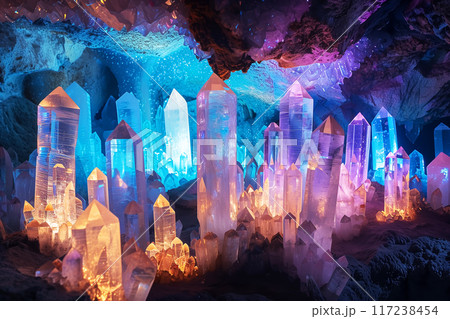 美しい鉱石が輝くファンタジーの世界の洞窟 AI生成画像