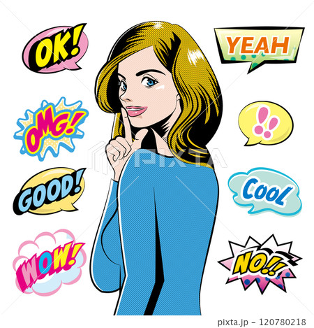 アメコミ風ウーマンイラストと吹き出しSET A