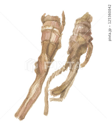 水彩で描いたヨロイグサと根 ビャクシ 白芷
