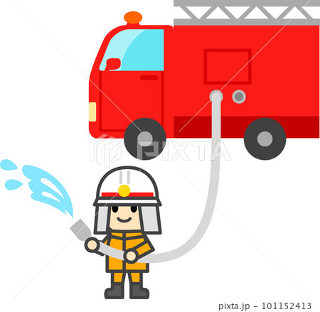 放水する消防士と消防車のデフォルメイラスト