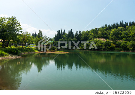 鏡ヶ池 入広瀬 夏の空 道の駅 新潟県魚沼市 鏡面