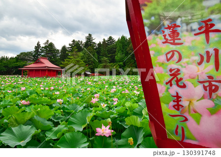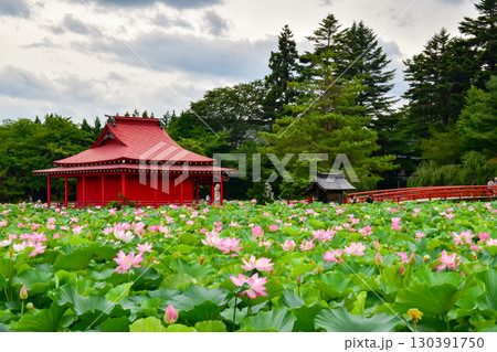 夏の猿賀公園鏡ヶ池と蓮の花 青森県平川市
