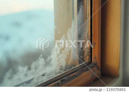 Frosty window with heavy mold, encapsulating a quiet, winter atmosphere