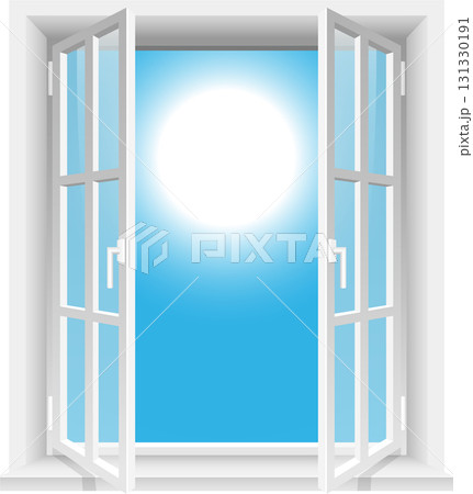Open window reveals bright, sunny sky. Crisp white frame invites fresh air and natural light.