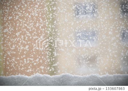 Snowflakes on a window with a blurred building in the background