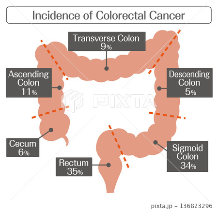 大腸がんの発生率と部位別構造イラスト