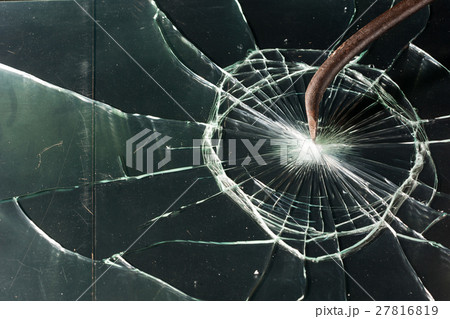 Broken glass texture. rusty crowbar