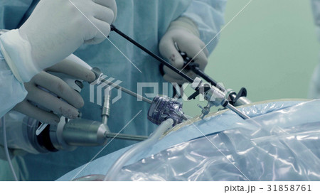 The surgeon's hands hold a surgical manipulator for minimally invasive surgery.