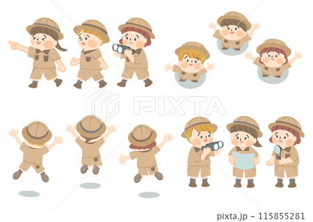 探検服を着た子ども達のイラストセット