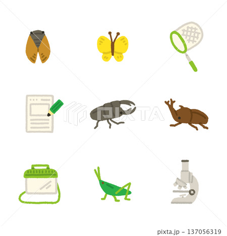 虫取り イラスト アイコンセット 夏休み 自由研究 手描き かわいい