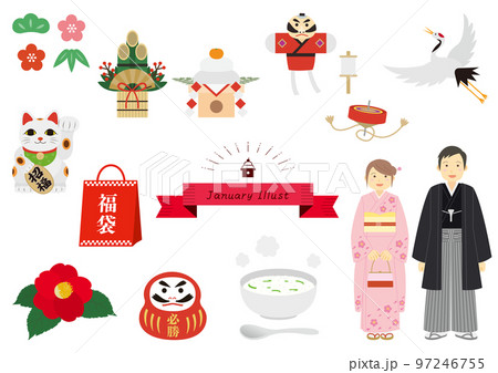 新年の縁起物。鏡餅のイラスト。お供え物。お正月のイメージ。和柄のデザイン。