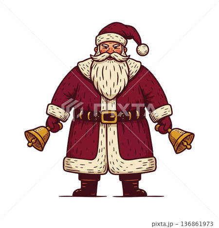 Santa Claus holding two golden bells festive Christmas holiday vector illustration