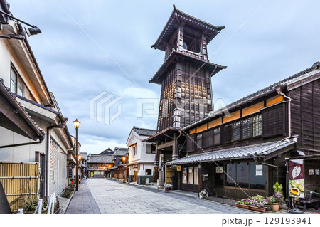 時の鐘を見る早朝の川越鐘つき通り