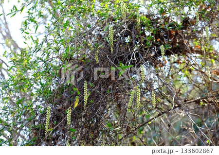 枯れ木に絡む蔓とキブシの花 【相模原市津久井 3月】
