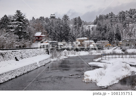 山と川のある町横手市の城と鐘撞堂のある雪景色