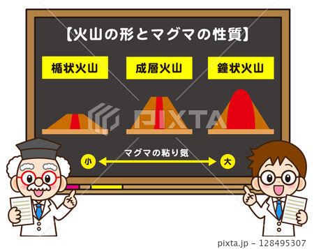火山の形とマグマ性質の説明をする博士と助手のイラスト素材