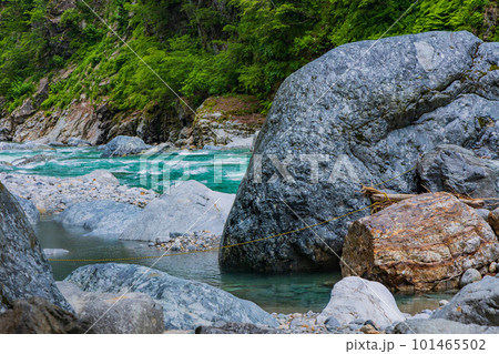 緑深い黒部峡谷鉄道沿線 鐘釣河原